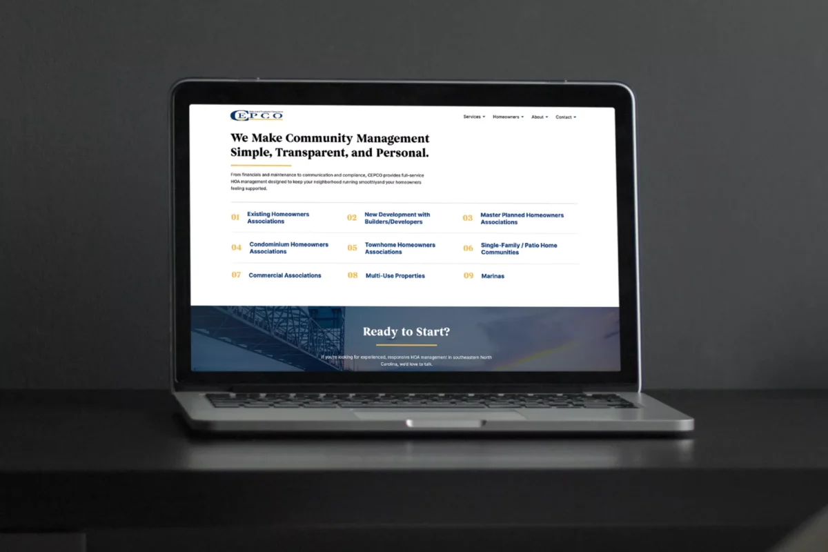 For CEPCO, we designed and developed a website that reflects their longstanding reputation in HOA management across coastal North Carolina. With more than 40 years of experience and deep roots in Wilmington, the site needed to communicate trust, transparency, and leadership in the industry. We structured the content to clearly explain their services, highlight their history, and position them as a reliable partner to HOA boards and homeowners.