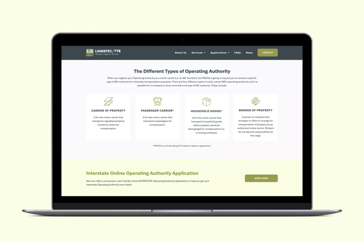Our custom website design for Operating Authority streamlines complex processes for trucking professionals. Featuring an intuitive interface, robust navigation, and secure online forms, this site simplifies DOT compliance services. Built with responsive design and optimized for SEO, it ensures users can easily access resources on any device, driving conversions.