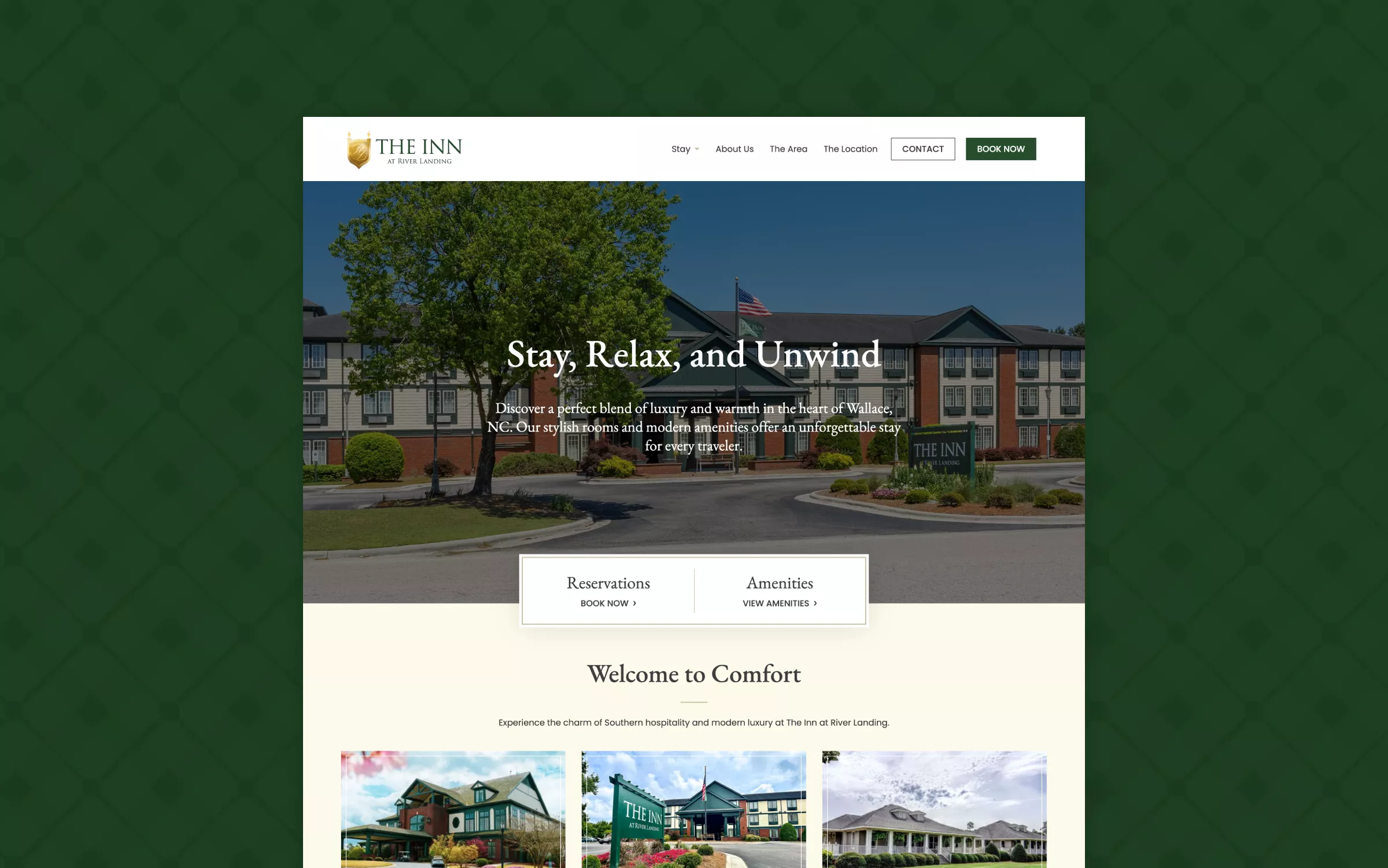 Located just outside the gates of River Landing in Wallace, NC, The Inn at River Landing offers guests the perfect blend of modern comfort and small-town charm. Locally owned and operated by the Murphy family, The Inn, Cottages, and Suites provide a variety of accommodations designed to make every stay feel relaxing and convenient.