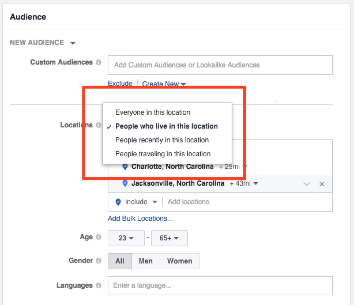 Within geo-targeting, there’s a dropdown menu. The drop down menu allows you the ability to target Facebook users who are merely traveling into Wilmington. This feature allows you to cater ad copy directly to those who are in town for special events. Below are a few geo-targeting options: